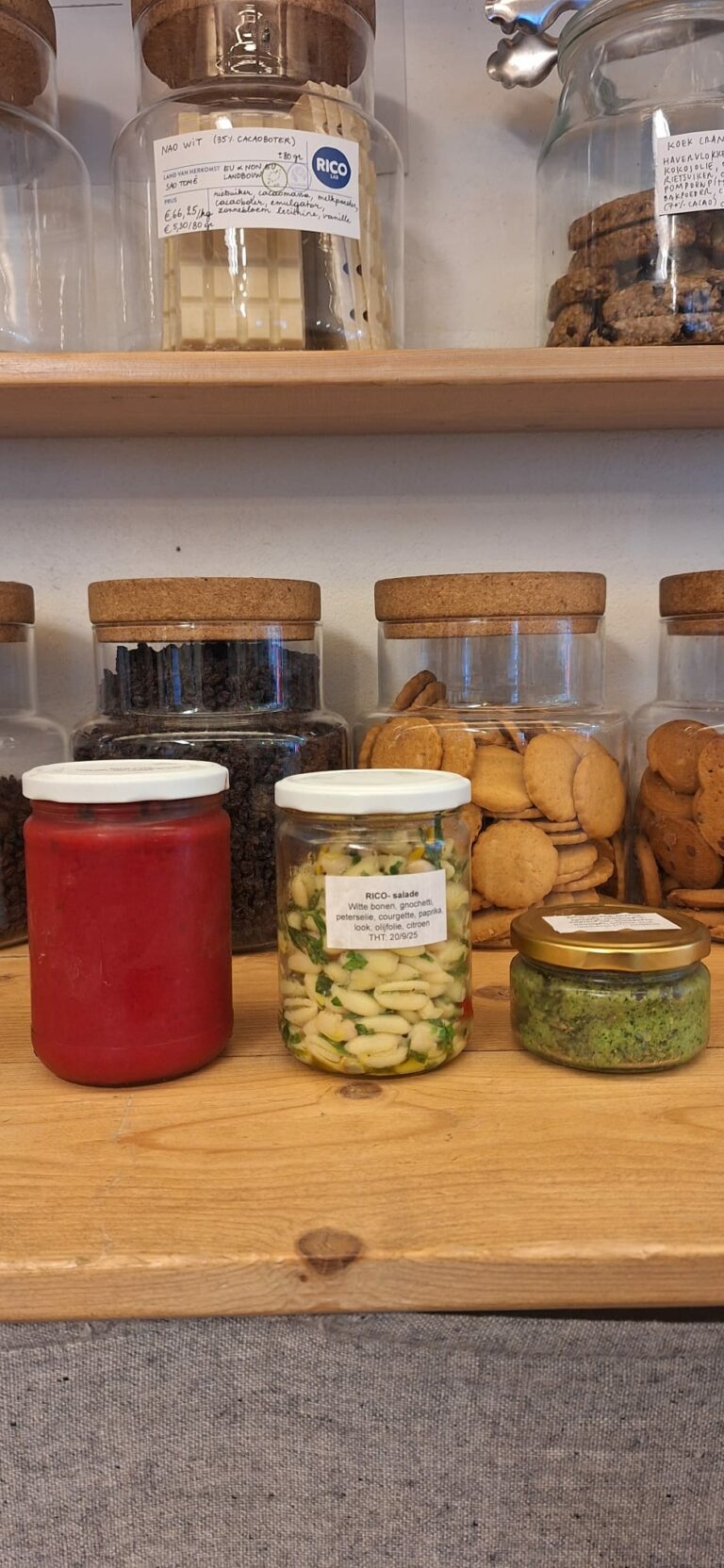 In onze koelkast vind je gevulde take-away bokalen met verse soep voor thuis, gezonde maaltijdsalades voor je picknick of onderweg, en vegan spreads voor de betere boterham. Op de bokalen zit leeggoed zodat je ze nadien makkelijk weer kan binnen brengen. Smakelijk!